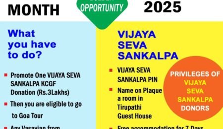 Organized by Vasavi Clubs International Promote One VIJAYA SEVA SANKALPA KCGF Donation (₹3 Lakhs)Eligible for an exciting Goa Tour in May 2025!Open to any Vasavian …